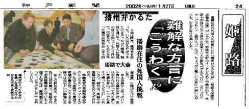 神戸新聞 2002年1月27日 日曜日 播磨在住の外国人を対象にした「播州弁かるた大会」(姫路市国際交流協会主催)が26日、姫路市本町のイーグレひめじで開かれた。米国や中国など7カ国の出身者16人が参加。「せんどぶり」(久しぶり)や「ごうわく」(腹が立つ)など、ちょっぴり難しい方言に戸惑いながらも、かるた取りを楽しんだ。 |